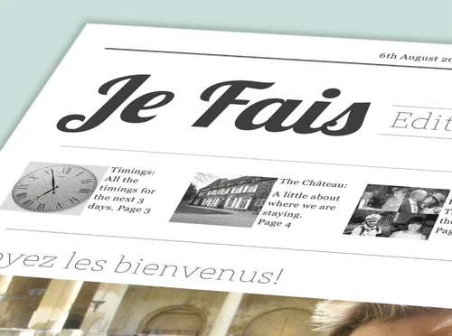 A location wedding in France, 50 guests all staying at a beautiful Château. What better way to let everybody know what’s going on than a personalised newspaper.